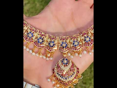 22K బంగారు పూతతో స్టెర్లింగ్ వెండితో చేసిన బహుళ వర్ణ జాడౌ నెక్లెస్. ఇది మంచినీటి ముత్యాలు మరియు సింథటిక్ కెంపులు మరియు నీలి నీలమణితో సెట్ చేయబడింది. వేలాడే పూసలు మంచినీటి ముత్యాలు.